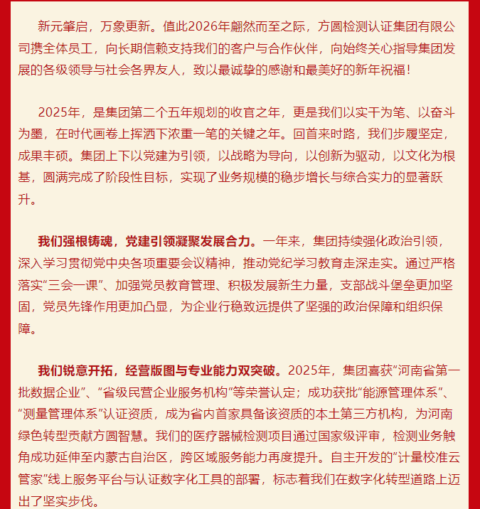 尊敬的客户及合作伙伴:您好!首先,衷心感谢您长期以来对方圆检测认证集团的信任与支持。正是得益于您的陪伴与认可,我们才能在计量校准服务的道路上不断探索创新,持续优化服务品质...