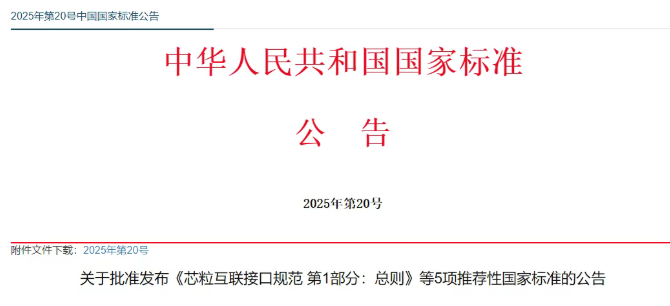 近日,国家市场监督管理总局(国家标准化管理委员会)批准发布《芯粒互联接口规范 第1部分:总则》等5项推荐性国家标准