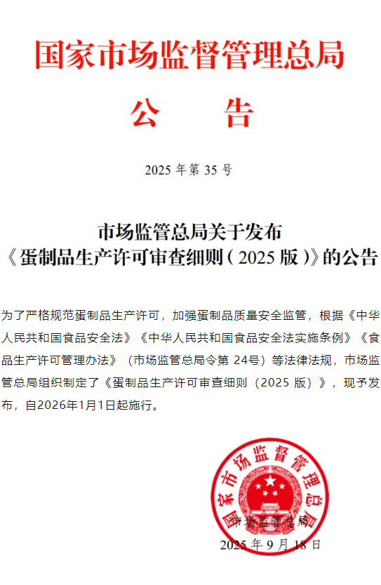 近日,市场监管总局发布《蛋制品生产许可审查细则(2025版)》(以下简称《细则》)。《细则》着重在三方面进行修订完善。一是按照法律法规的新规定、食品安全国家标准的新要求,进一步...