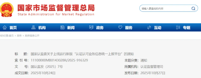10月27日,国家认监委发布关于上线运行新版“认证认可业务信息统一上报平台”的通知,工作启动时间为2025年11月9日18时现有系统陆续下线功能模块,直至2025年12月8日8...