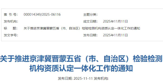 近日,京津冀晋蒙五省(市、自治区)市场监管部门联合发布通知,经共同协商研究,决定在区域内全面推进检验检测机构资质认定一体化工作,围绕规范分支机构资质认定管理、统一资质认定标志(CMA)使用管理、建立资质认定协同评审机制、推进授权签字人考题与考核一体化等四方面作出具体部署。