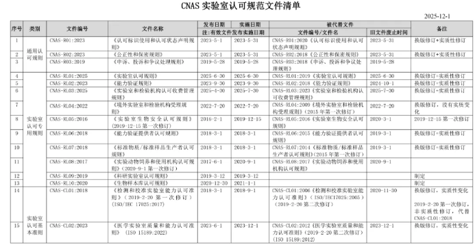 近日,中国合格评定国家认可委员会(CNAS)发布最新CNAS实验室认可规范文件清单,共包含127个文件。