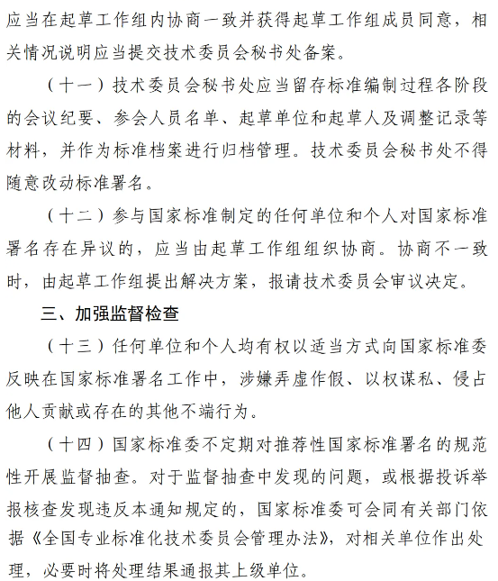 近日,国家标准委印发《关于进一步规范推荐性国家标准起草单位和起草人署名的通知》,要求各全国专业标准化技术委员会坚持实事求是、公开透明原则,不得为无实质性技术贡献的单位和个人“有偿署名”或“变相挂名”。