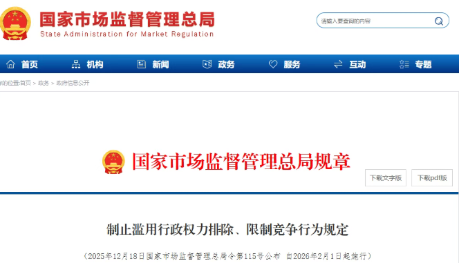 12月26日晚,据“市说新语”微信公众号消息,为强化制止滥用行政权力排除、限制竞争的反垄断执法,进一步完善公平竞争制度规则,推动有效解决不当干预市场竞争问题,维护公平竞争市场秩序,国家市场监督管理总局制定并发布修订后的《制止滥用行政权力排除、限制竞争行为规定》,自2026年2月1日起施行。