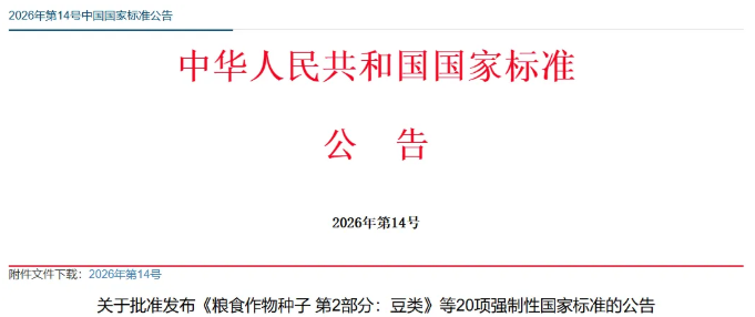 近日,国家市场监督管理总局(国家标准化管理委员会)批准发布《粮食作物种子 第2部分:豆类》等20项强制性国家标准。