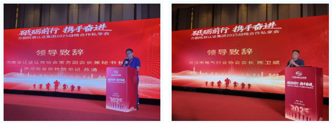随后,河南省认证认可协会常务副会长兼秘书长苏涌、武汉市电气行业协会会长陈卫斌分别发表致辞。苏秘书长对方圆检测认证集团成立二十三周年表示祝贺,并对集团公司为行业健康发展所做的贡献给予了高度评价。陈会长从行业角度出发,肯定了方圆检测认证集团在电气领域检测认证的专业能力和服务区域质量工作的引领作用。