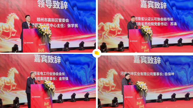 随后,郑州市高新区双桥园区运营中心主任 张学民、河南省认证认可协会秘书长苏涌、河南省电工行业协会会长金世强及客户代表河南中坤实业有限公司董事长岳保坤先后登台致辞。他们对集团在推动区域产业高质量发展、助力行业认证认可体系建设、赋能企业提质升级等方面作出的重要贡献给予高度评价,并期待集团在新的一年继续发挥技术优势,为区域经济与行业高质量发展注入更强动能。
