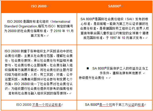 SA 8000®即“社会责任标准”,是Social Accountability 8000的英文简称,由社会责任国际组织(SAI)制定与执行,是全球首个道德规范国际标准。自1997年问世以来,它创建了一个衡量社会责任的共同语言,它适用于世界各地,任何行业、不同规模的公司,与ISO 9001质量管理体系,ISO 14001环境管理体系一样,是第一个在社会责任领域可以用于审核和第三方认证的国际标准。其宗旨是确保供应商所供应的产品皆符合社会责任标准的要求,即组织的运营必须考虑社会公平工作条件、卓越的健康和安全条款以及环保的生产状况,利用SA 8000®标准来展示组织的社会责任,这将强化组织的社会职责(CSR),改善员工、客户和公众对组织的信心。