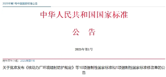 近日,国家市场监督管理总局(国家标准化管理委员会)批准发布《核动力厂环境辐射防护规定》等10项强制性国家标准和1项强制性国家标准修改单。