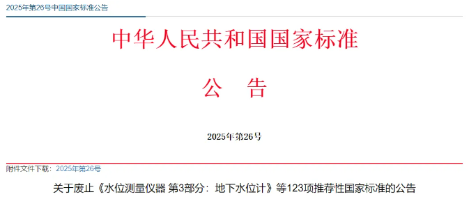 近日,国家市场监督管理总局(国家标准化管理委员会)发布公告,废止《水位测量仪器 第3部分:地下水位计》等123项推荐性国家标准。